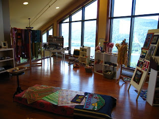 This beautiful display holds the work of Brenda Stratton's felted scarves, Rilla Marshall's woven scarves and Shawn's knit scarves. After I saw that I was actually selling some yarn, I took advantage of my new found wealth to purchase one of Rilla's scarves. She weaves them in two colours with merino and silk, then dyes them. The wool and silk pick up the dye differently resulting in a complex fabric. The one I chose also is felted slightly so that the merino shrinks making the silk stripe pucker a little. Wonderful, subtle and soft. It practically leapt into my hands as I looked at the display.